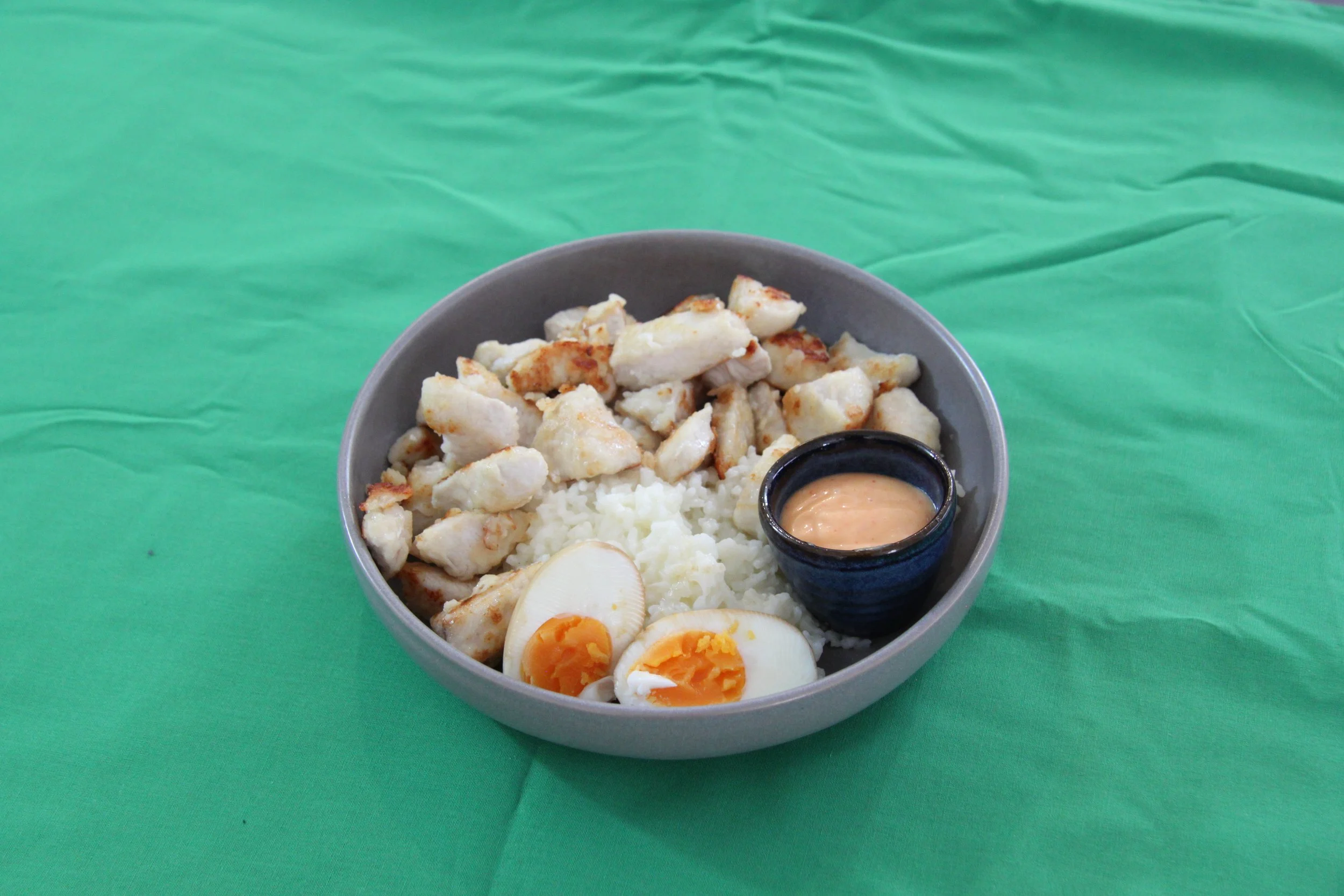 Marinated and Breaded chicken with rice and ramen eggs, a simple alternative for dinner.
